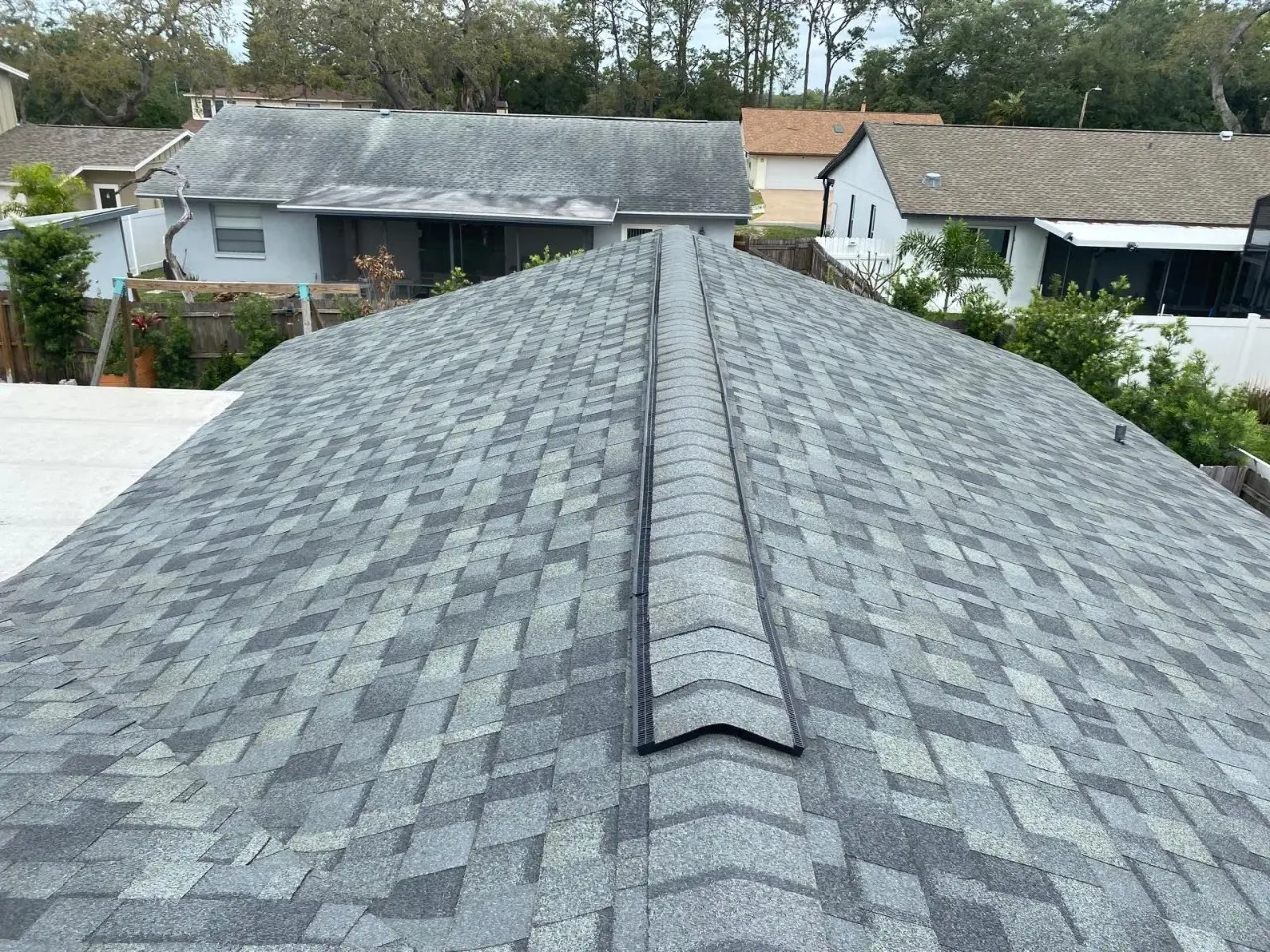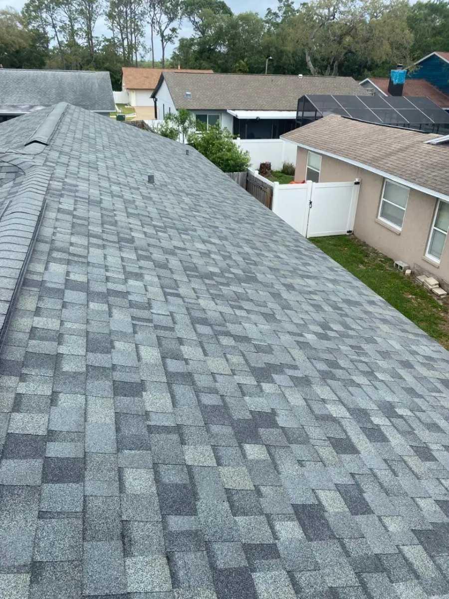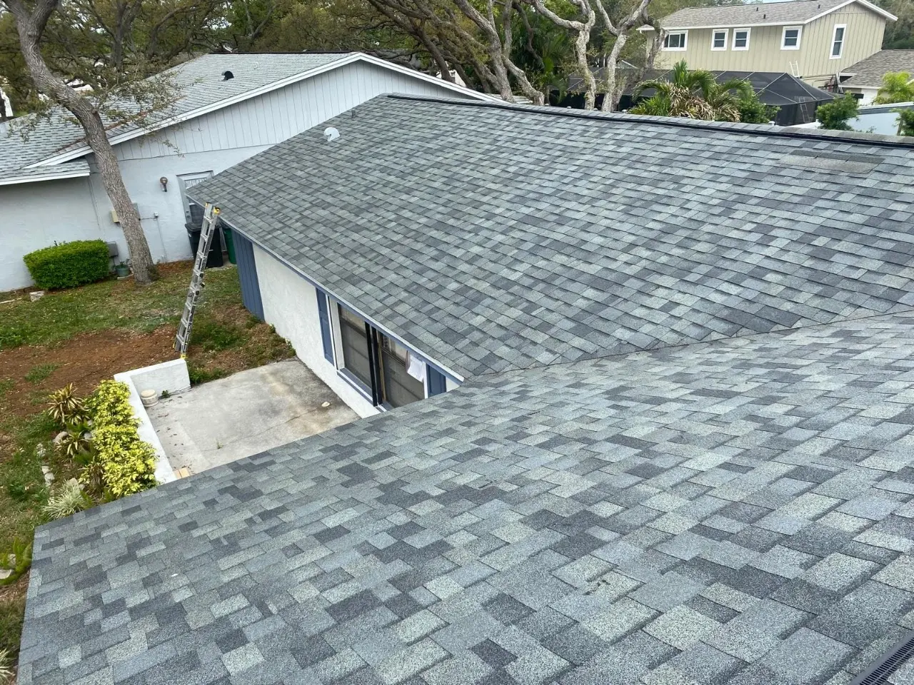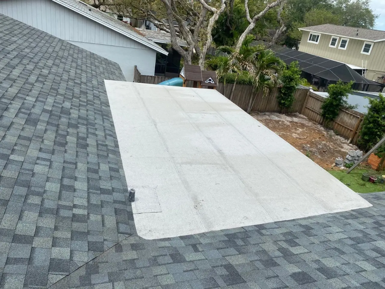 When a roof reaches the end of its service life, the condition beneath the shingles often reveals a more significant story. This was the case for a home in Safety Harbor, Florida, where our team found that about half of the roof was already covered with tarps because it was leaking and falling apart. The property needed a long-lasting roof that could withstand local weather, heavy rain, and coastal humidity. After reviewing the different materials and site conditions, we installed 29 squares of Owens Corning Duration Estate Gray shingles and 5 squares of white Modified Bitumen roofing on the flat areas.