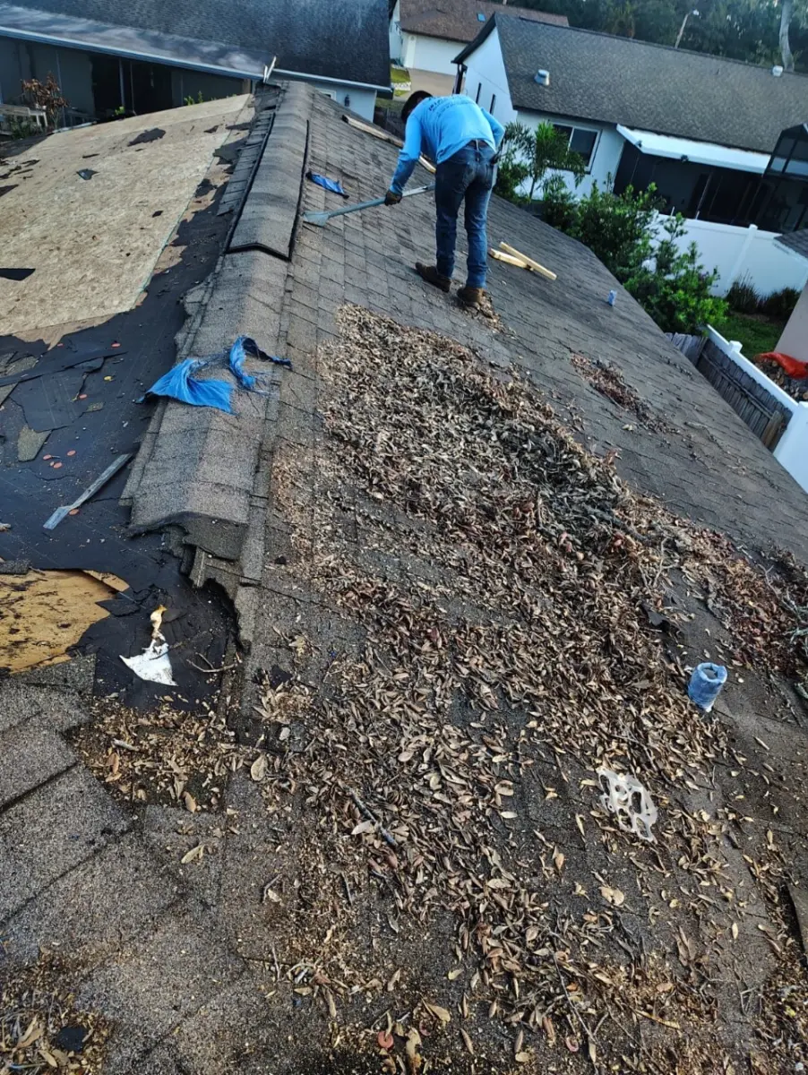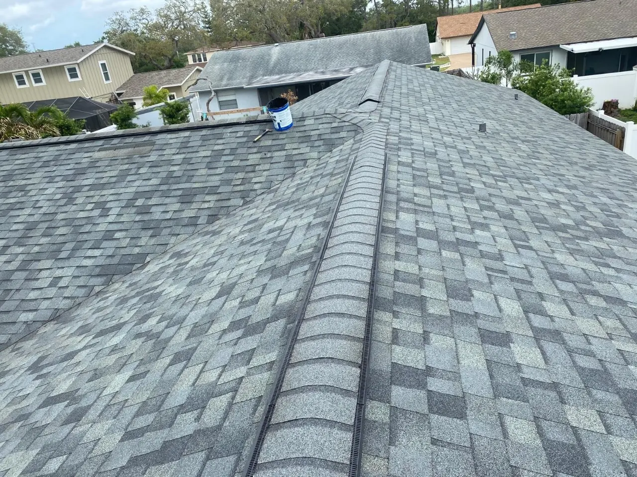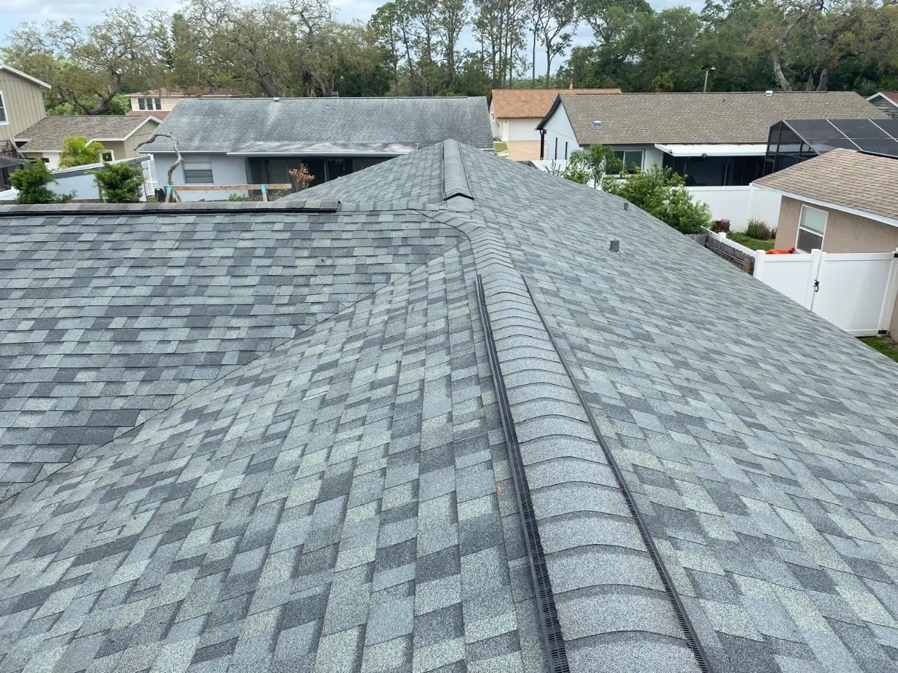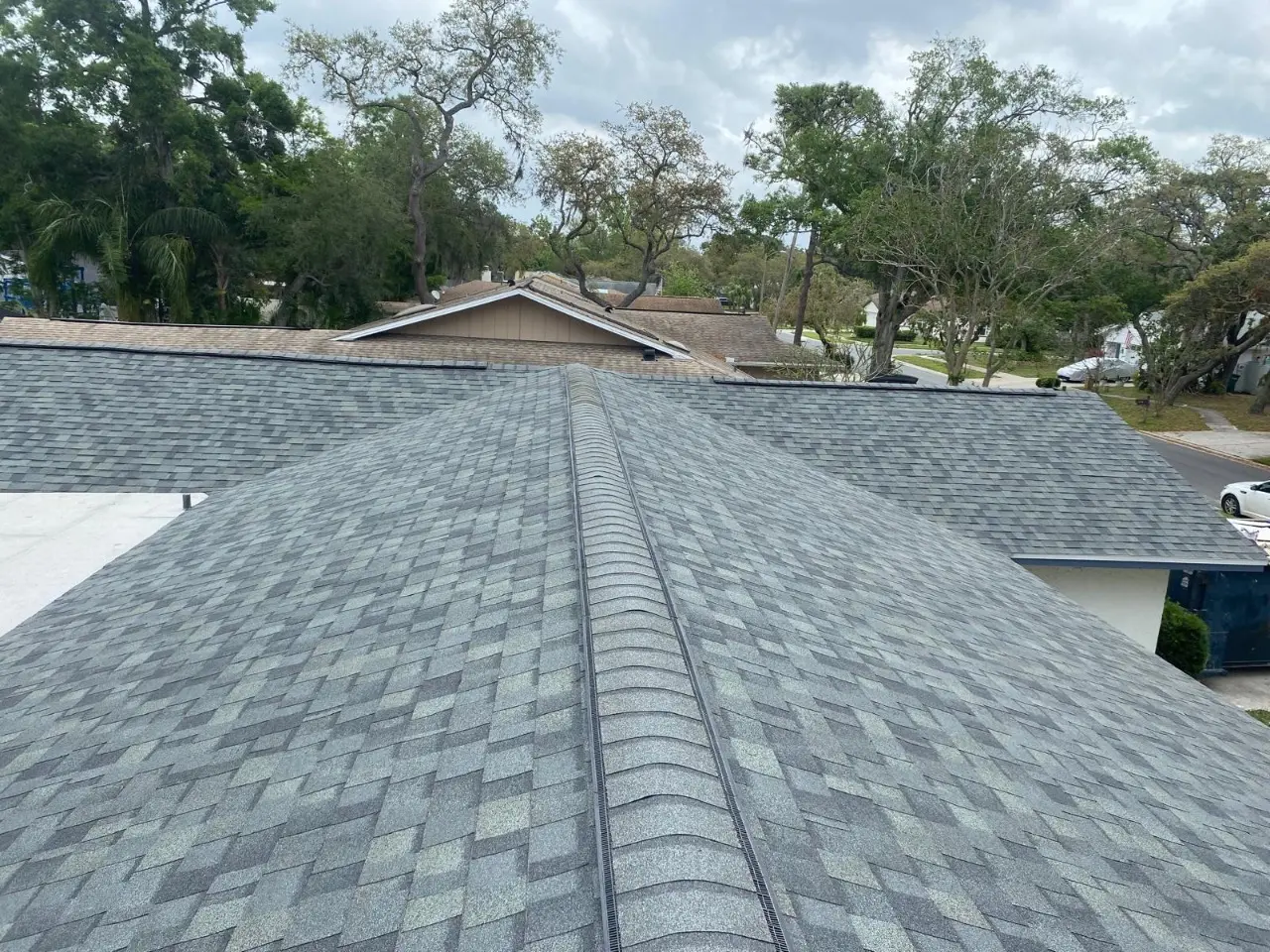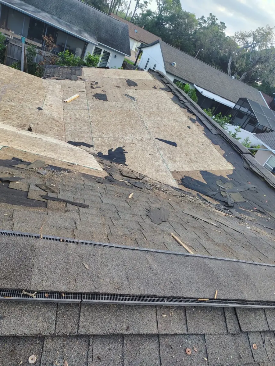 When a roof reaches the end of its service life, the condition beneath the shingles often reveals a more significant story. This was the case for a home in Safety Harbor, Florida, where our team found that about half of the roof was already covered with tarps because it was leaking and falling apart. The property needed a long-lasting roof that could withstand local weather, heavy rain, and coastal humidity. After reviewing the different materials and site conditions, we installed 29 squares of Owens Corning Duration Estate Gray shingles and 5 squares of white Modified Bitumen roofing on the flat areas.